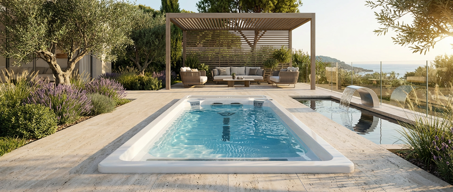 With its 6 x 2.35-meter dimensions, the pool is designed for maximum comfort and functionality. There are sun loungers at both ends, one of which is positioned 10 cm below the water level, providing the perfect spot for relaxation.
