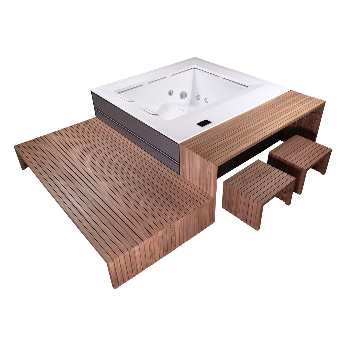 The built-in ambient LED lighting and customizable side paneling ensure your overflow hot tub blends effortlessly with any outdoor setting.