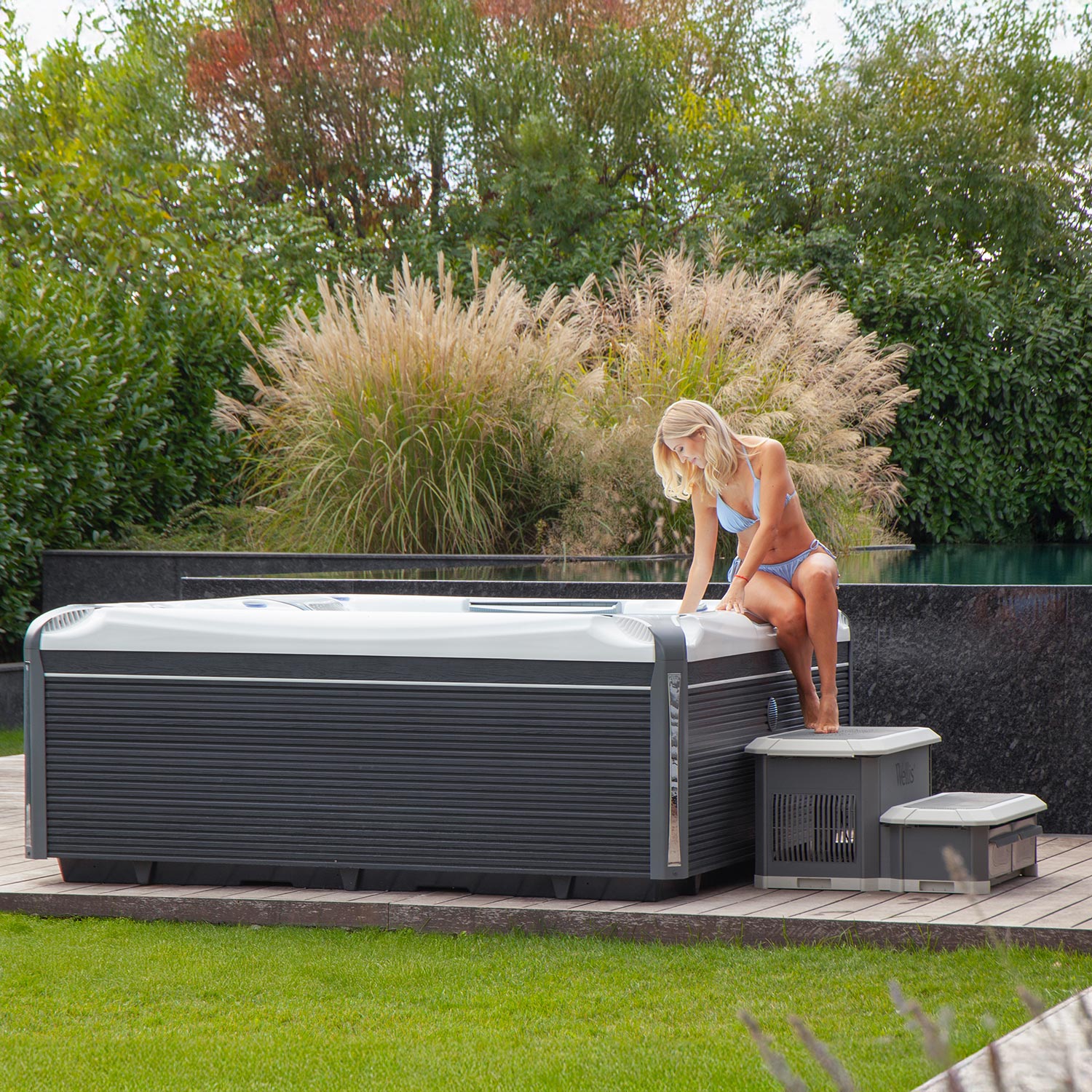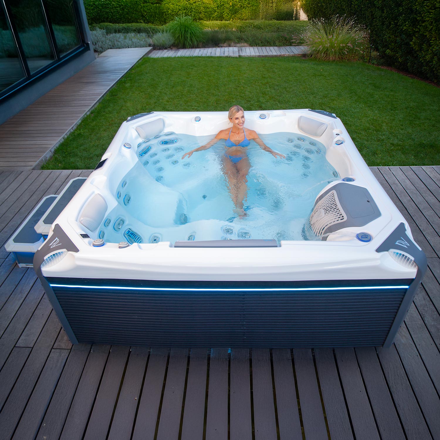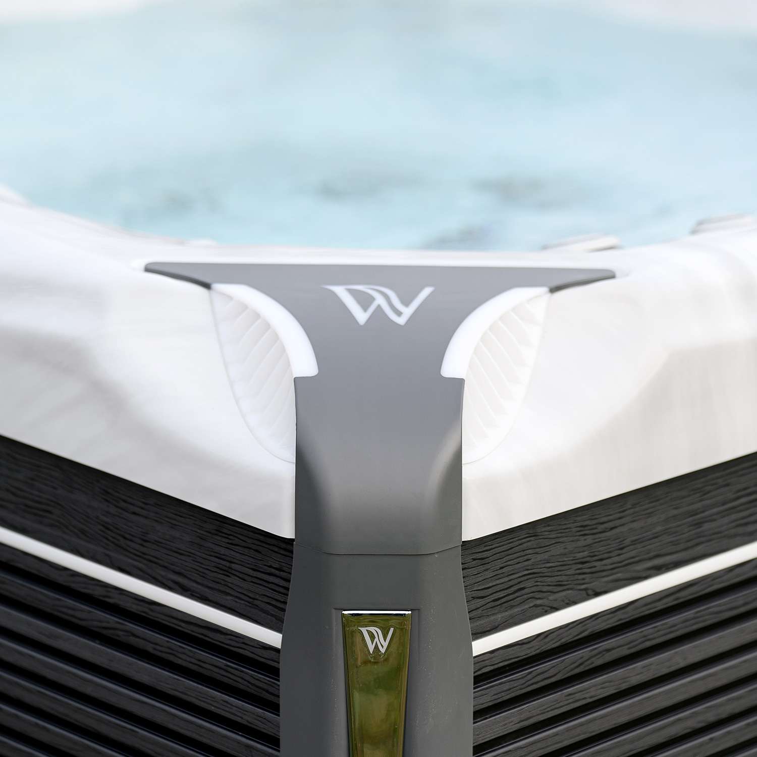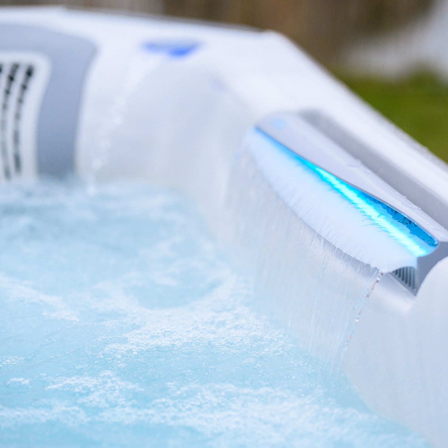 The LightSide™ cabinet system appears in PeakLife spas, which include concealed lighting beneath the corner elements, and an in-house-developed LED strip running along the spa’s side cover.